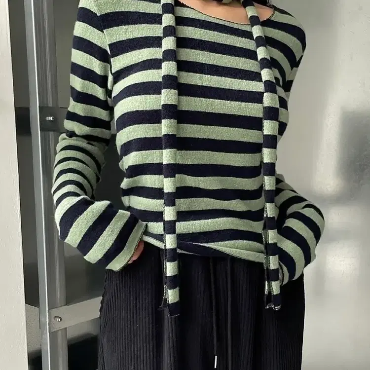 번개i! 민트 블랙 검정 스트라이프 단가라 머플러 목도리 스카프 보트넥 니트