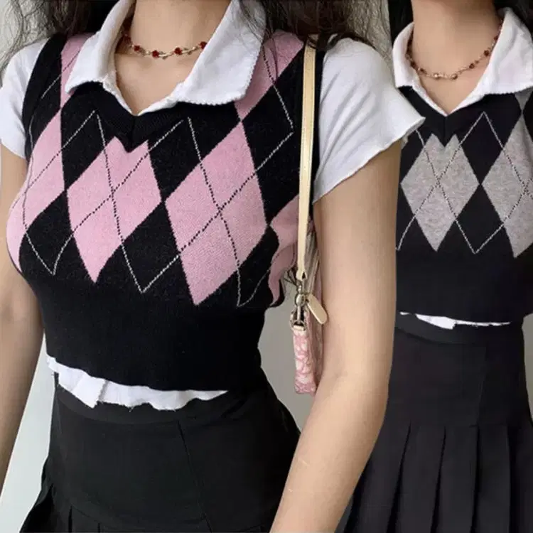 번개핑크 아가일 패턴 크롭 니트 조끼
