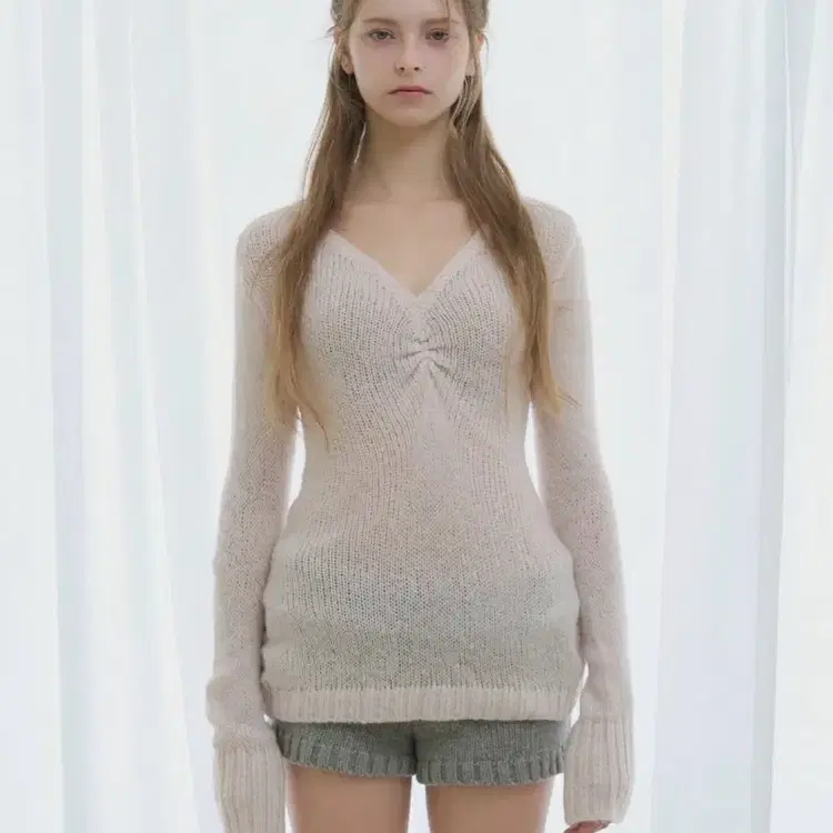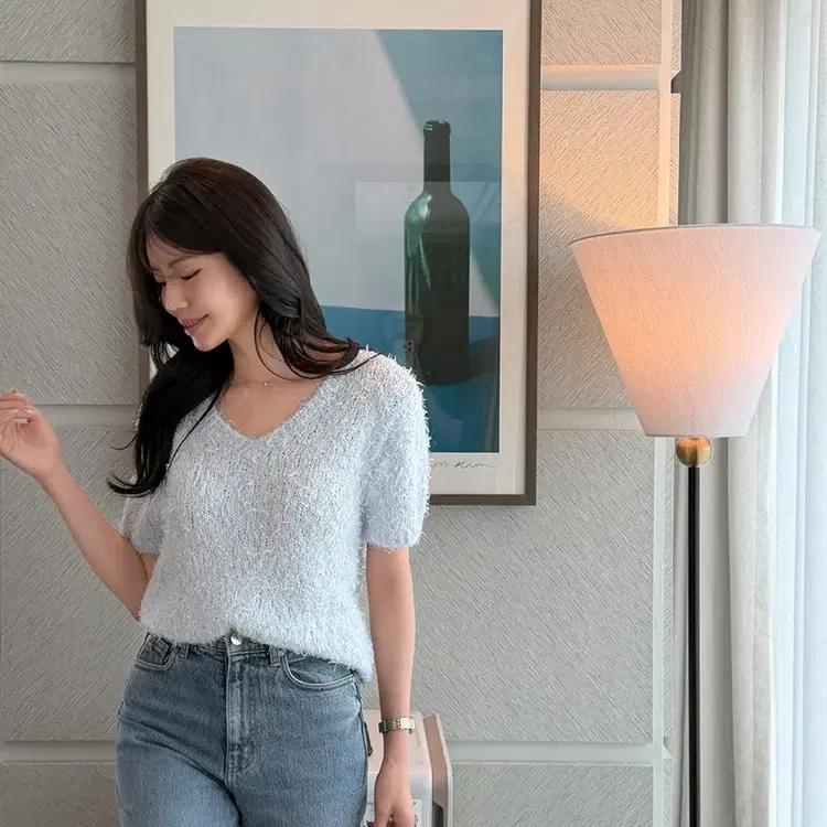 번개하와 26ss 모모 플룸 니트 (에어블루) 브이넥 반팔부클니트 날개사 탑