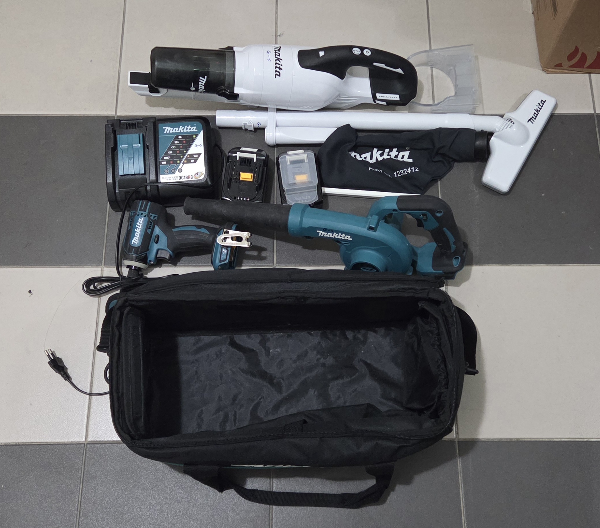 플리마끼다 정품배터리2개 고속충전기+임팩드릴+송풍기+청소기 판매합니다.