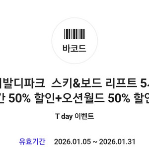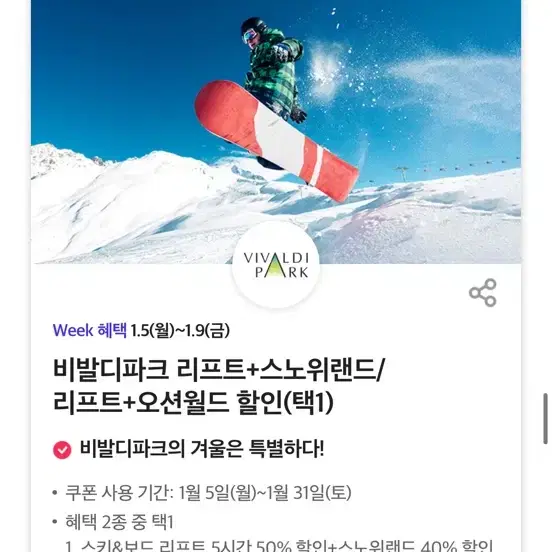 비발디파크 스키&보드 리프트5시간 50%할인 + 오션월드 50%할인 (1/31)