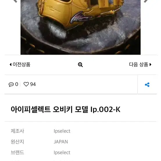 번개아이피셀렉트 내야 글러브 오비키 모델 현재 단종(품절)상태 좋음
