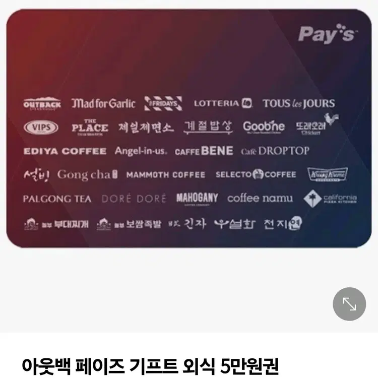 44900) 페이즈 외식 5만원권 (아웃백,빕스,서가앤쿡,매드포갈릭,롯데리아,이디야,설빙) 유효기간 1년
