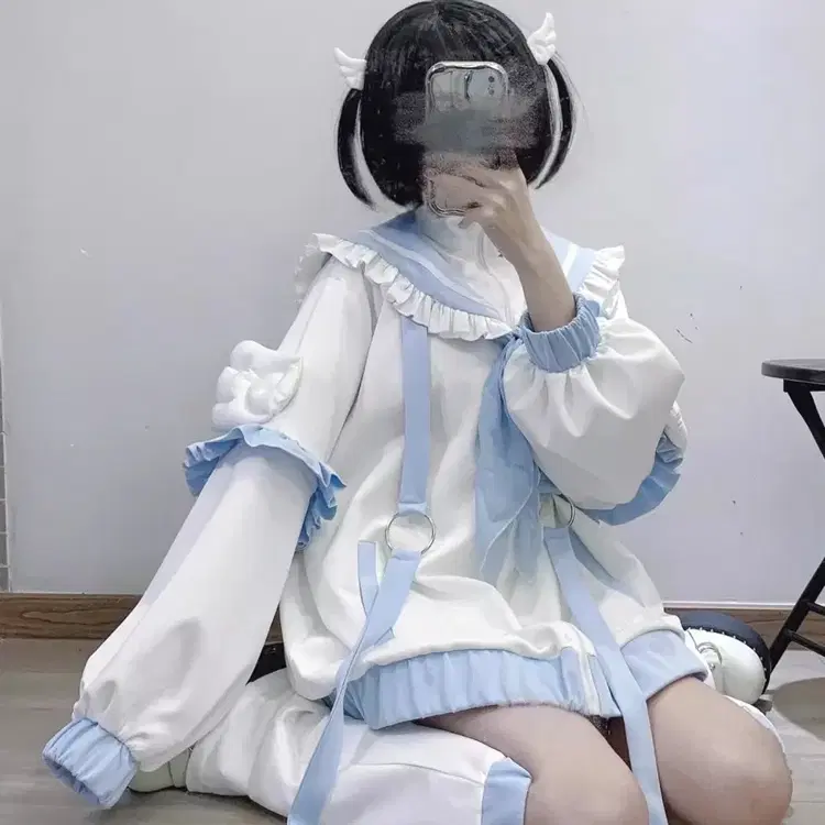 번개지뢰계 양산형 아쿠아 계열 해군 칼라 코트 날개 카디 상의+레그워머 세트