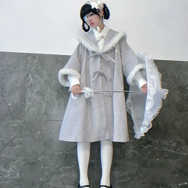 번개서브컬처 지뢰계 밝은 회색 모피 테두리 해군 넥 로리타 코트