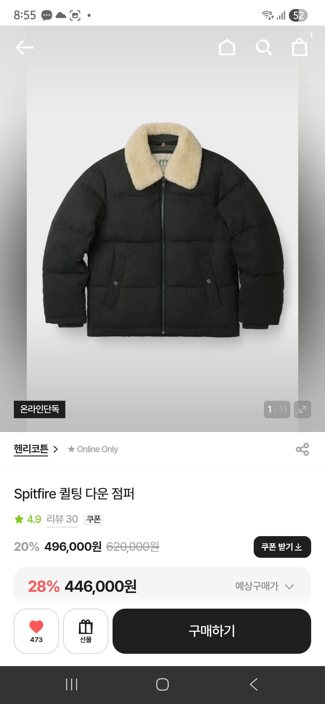 헨리코튼 스핏파이어 코트 다크카키 110