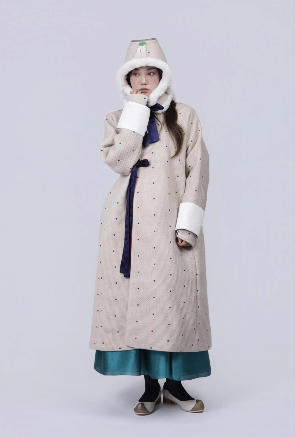 플리송화바이정(송화한복)베이지 도트 누빔 두루마기 M