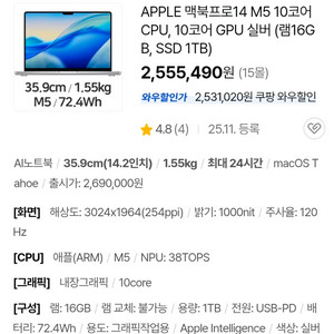 번개애플 맥북프로 M1max 16인치 RAM 64GB SSD 2TB