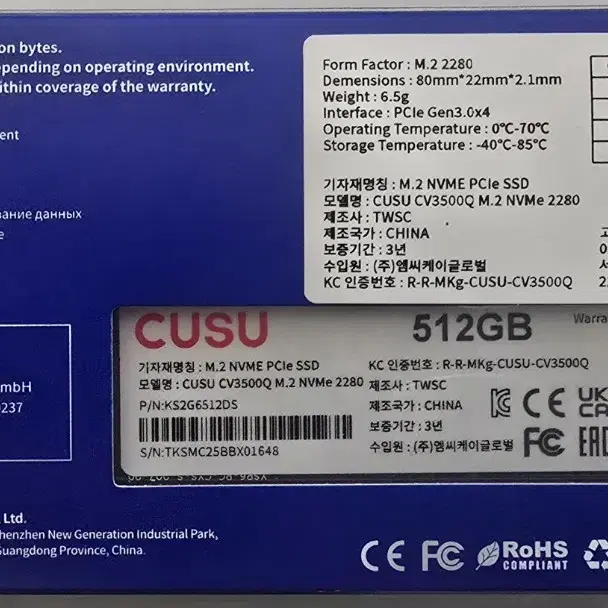 번개CUSU SSD M.2 CV3500Q 512G 미개봉 팝니다.